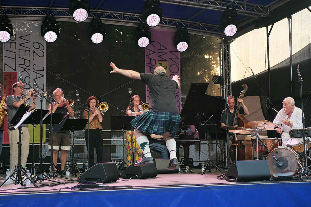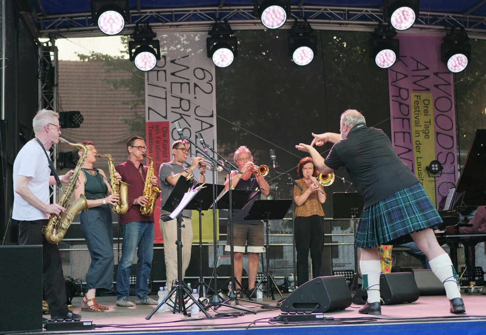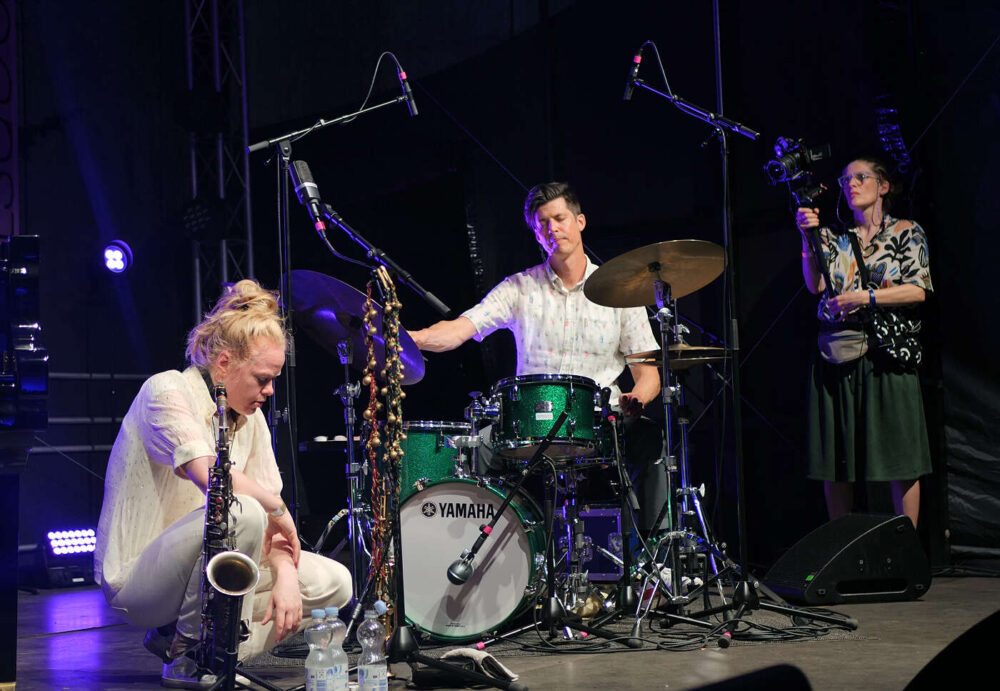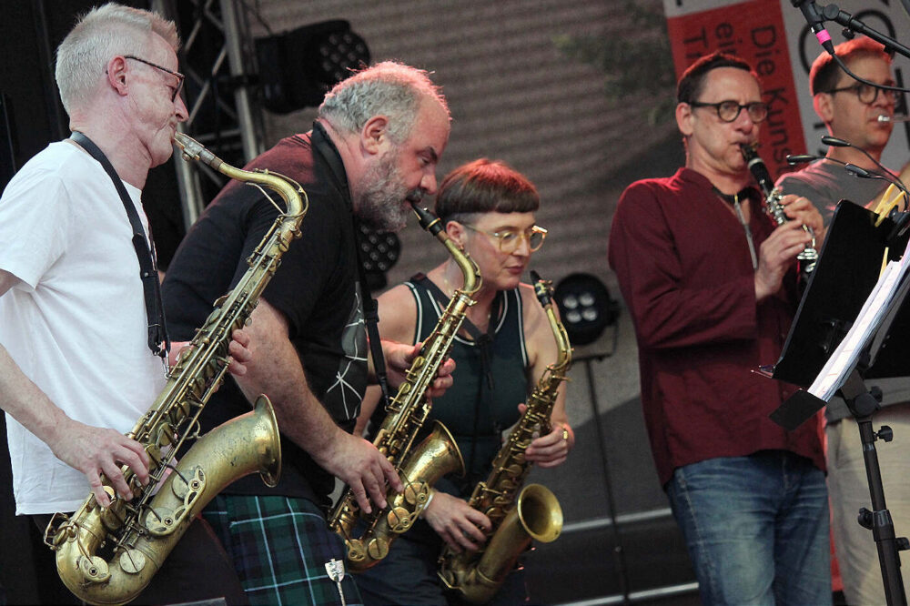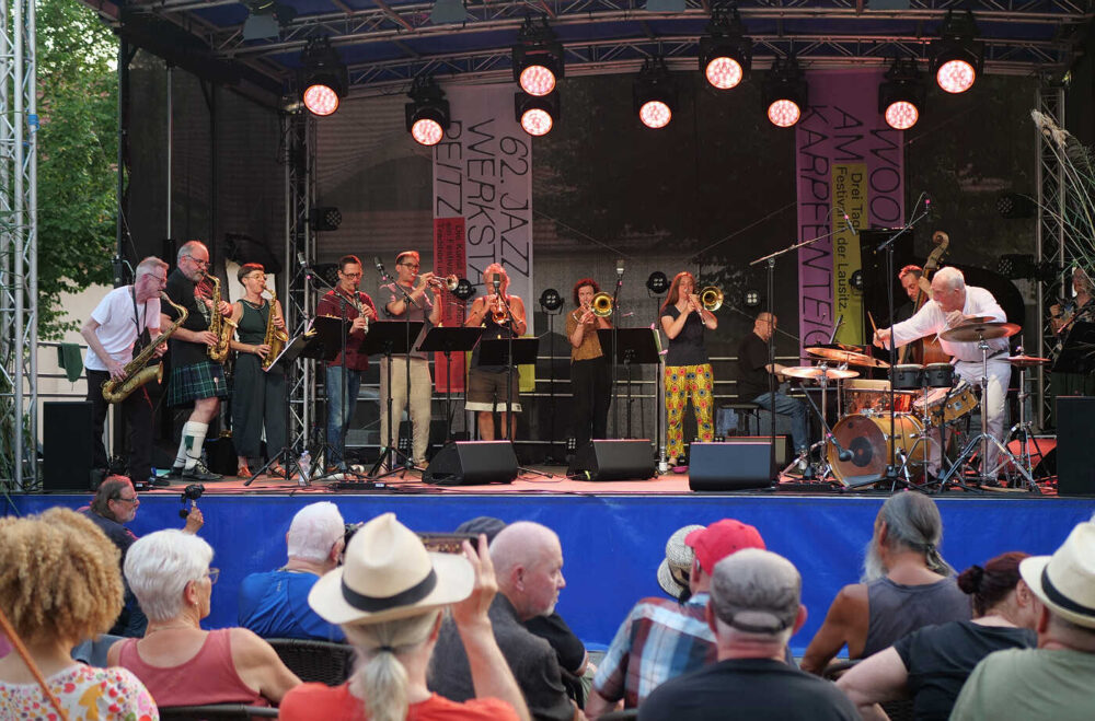 Zum zweiten Mal hat Marie Blobel nun das traditionsreiche Festival der Jazzwerkstatt kuratiert. Im vergangenen Jahr trat sie die Nachfolge ihres Vaters Ulli Blobel als Veranstalterin an. Unter dem Motto „Die Kunst der Freiheit – ein Festival zwischen Tradition und Wandel“ ist es ihr gelungen, diesmal 20 Konzerte auf mehreren Bühnen auf dem Gelände des historischen Hüttenwerks und zum Abschluss in der Stüler-Kirche zu präsentieren. Zum Auftakt des Festivals begeisterte das Big-Band-Projekt „Brother & Sisterhood“ des Schlagzeugers Günter Baby Sommer mit elf Musikerinnen und Musikern auf der Bühne. Offenbar ein gelungener Schachzug, denn bereits am Freitag war das Publikum zum Konzertplatz geströmt.
