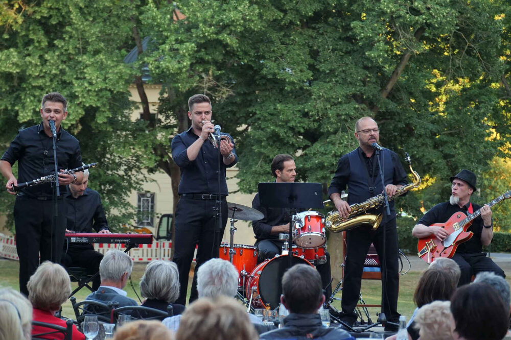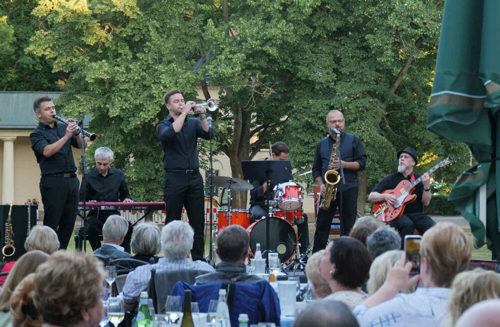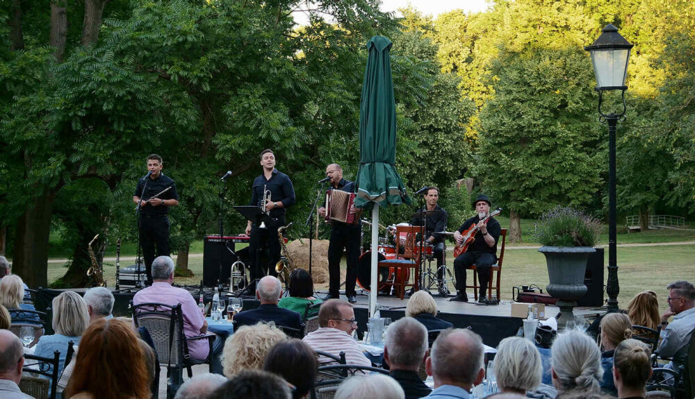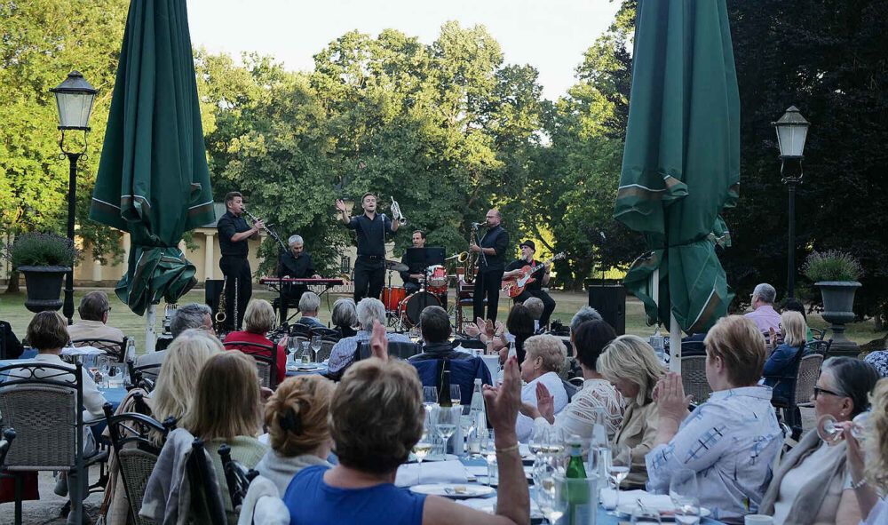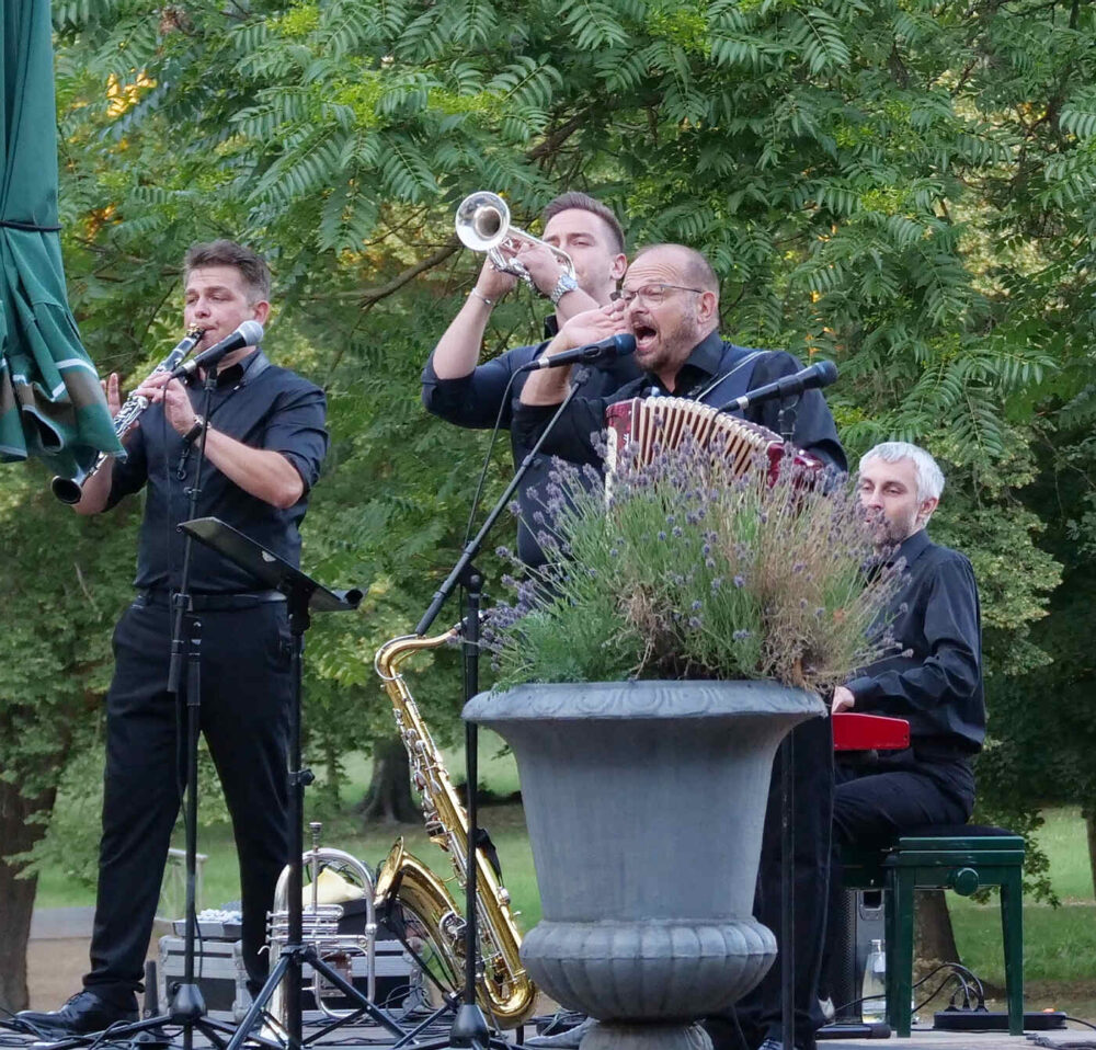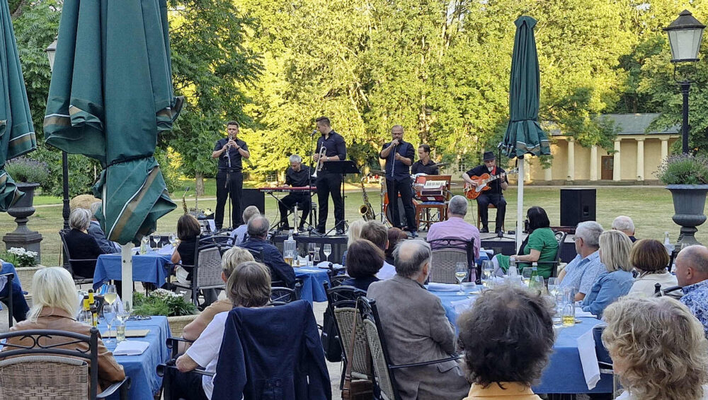 Und es ist Tradition, dass es vor dem Spreewald- und Schützenfest am ersten Juli-Wochenende in Lübbenau einen musikalischen Leckerbissen gibt – das Swingladen-Konzert als Open-Air-Veranstaltung auf der Schlossterrasse. Als gut gelaunter Gastgeber begrüßt Rochus Graf zu Lynar die Besucher. Er stellt die aus Berlin angereisten Musiker vor, die hier nicht unbekannt sind – die Familie Ginzburg, eine Klezmer-Band in der sechsten Generation. Nach 150 Jahren musikalischer Weltreise durch vier Kontinente ist die Ginzburg-Dynastie inzwischen wieder an ihren historischen Wurzeln und zurück in der alten Berliner Heimat. Selbstbewusst sagen die Musiker, dass sie im Herzen Europas gegenwärtig die einzige praktizierende Klezmer-Dynastie seien. Sie fühlen sich in der Berliner Philharmonie als Musiker genauso zu Hause wie im Spreewald. Im Jahr 2022 war das Jiddish Swing Orchestra schon einmal zu Gast in Lübbenau.