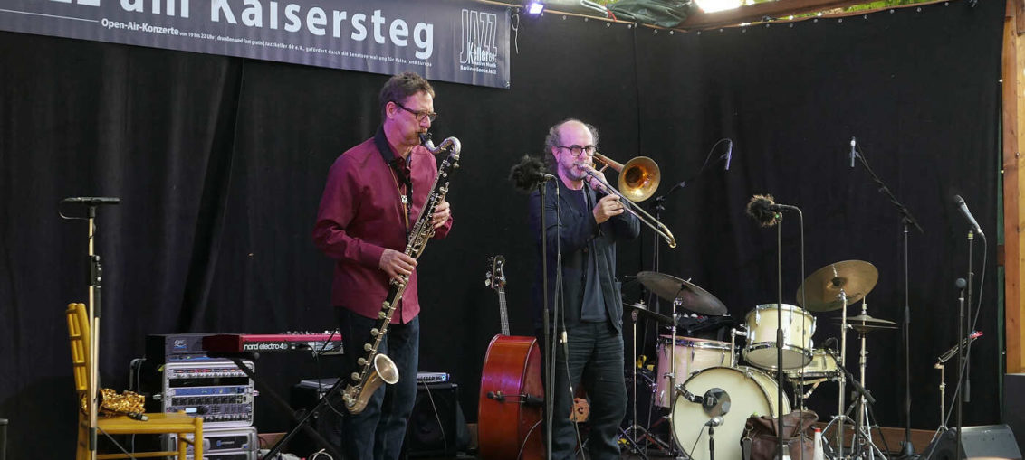 Der Jazzkeller Treptow hat am 27. Juli 2019 zum Jazz am Kaisersteg in Berlin-Oberschöneweide eingeladen. Auf der Open-Air-Bühne in der Hasselwerderstraße spielten der Berliner Frank Gratkowski (alto sax, clarinet, bass clarinet) und der Sizilianer Sebastiano „Sebi“ Tramontana (trombone) „Instant Songs“ – Lieder, die im Augenblick entstehen. Der musikalische Dialog steht im Mittelpunkt des Spiels, auch wenn einige Songs sehr abstrakt sind, in andere Mehrklänge und Geräusche wie das Singen eines Vogels einbezogen werden. Wolf-P. „Assi“ Glöde, Vorsitzender des Vereins Jazzkeller 69, erinnerte an 50 Jahre Jazzkeller Treptow und erläuterte die aktuellen Bedingungen, in Berlin Jazzkonzerte zu veranstalten. Dank einer Reihe von Unterstützern findet der Kultursommer im Garten statt – trotz der Querelen um die Spielstätte. Ab September gibt es wieder Clubkonzerte im Aufsturz, Oranienburger Straße 67. Weitere Infos unter www.jazzkeller69.de.