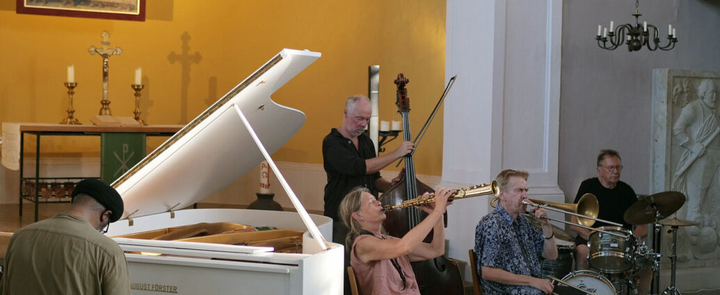 Probe in der Stüler Kirche Peitz am 14. August 2025 in Vorbereitung auf das Konzert „Willi Kellers‘ Adventure in Sonic Freedom“ am 16. August auf der Open Air Bühne am Peitzer Hüttenwerk mit Lotte Anker (sax), Steve Swell (trombone), Pat Thomas (p), Matthias Bauer (bass) und Willi Kellers (drums). UnterWeiter lesen